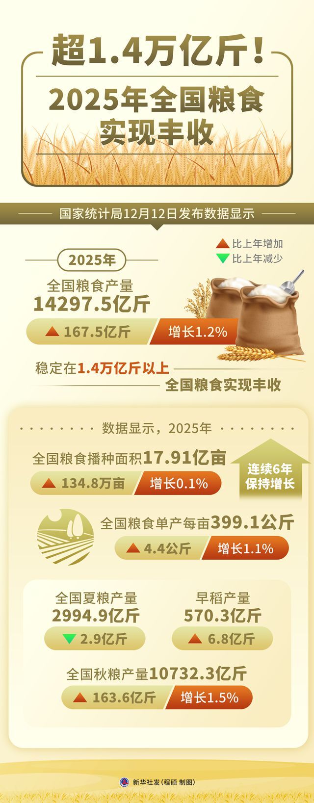 国家统计局12月12日发布数据显示,2025年,全国粮食产量14297.5亿斤,比上年增加167.5亿斤,增长1.2%,稳定在1.4万亿斤以上,全国粮食实现丰收。
